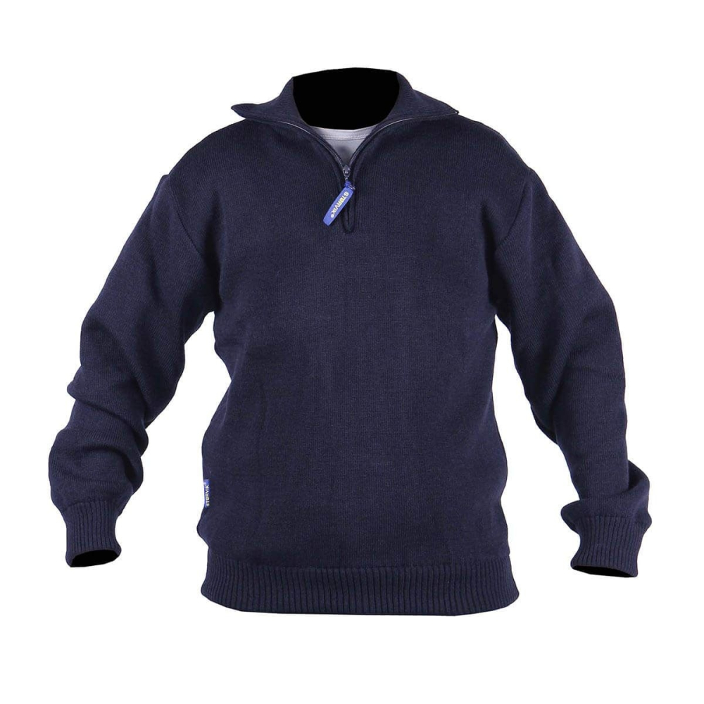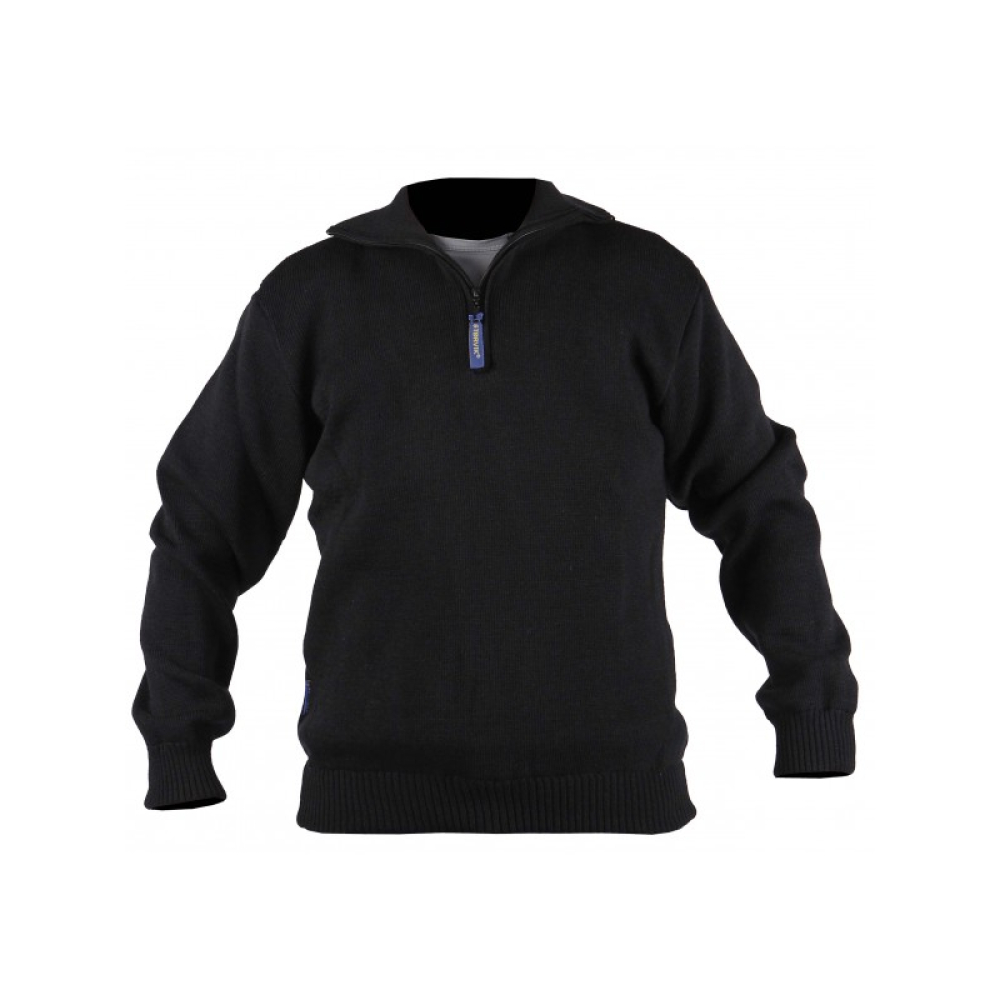 - De kotterstrui heeft een hoge kraag voorzien van een ritssluiting
